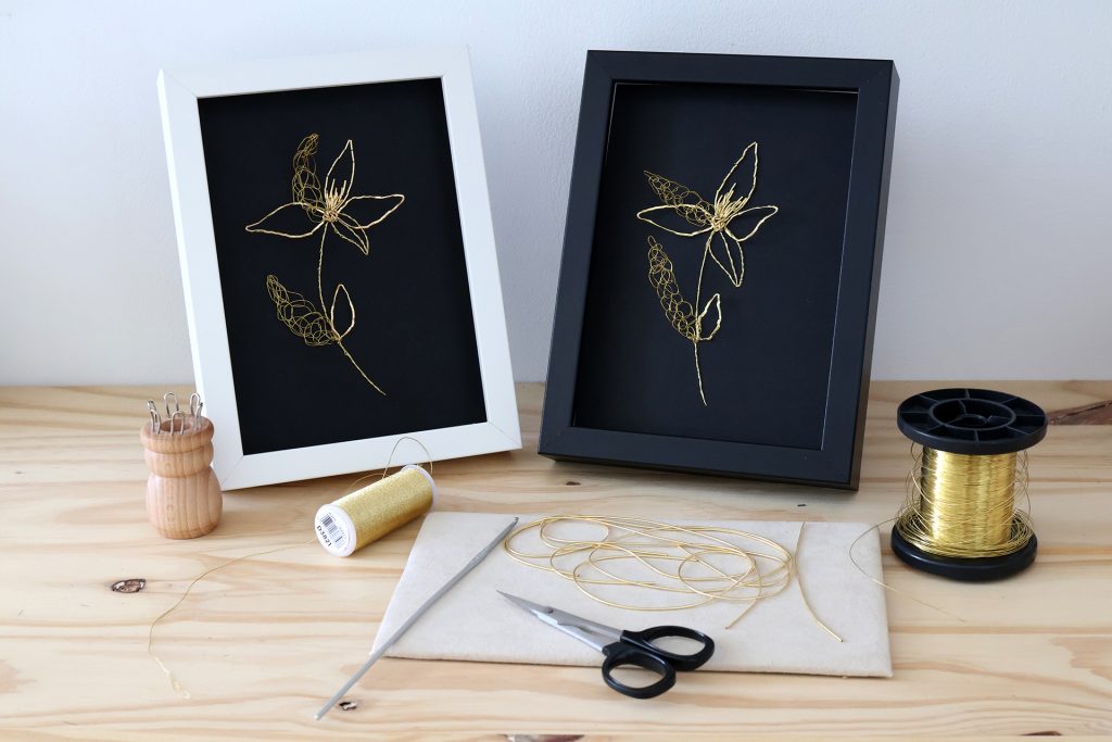 Vous travaillerez sur papier, support original qui mettra en valeur la lumière et la texture du fil métallique. Guidé par Marie, vous explorerez différentes techniques comme la broderie traditionnelle au fil d’or, mais aussi des approches plus contemporaines telles que le martelage de la cannetille ou l’utilisation du tricotin. Petit à petit, vous verrez apparaître une composition florale, construite à votre rythme, en jouant sur les reliefs, les volumes et les effets graphiques.