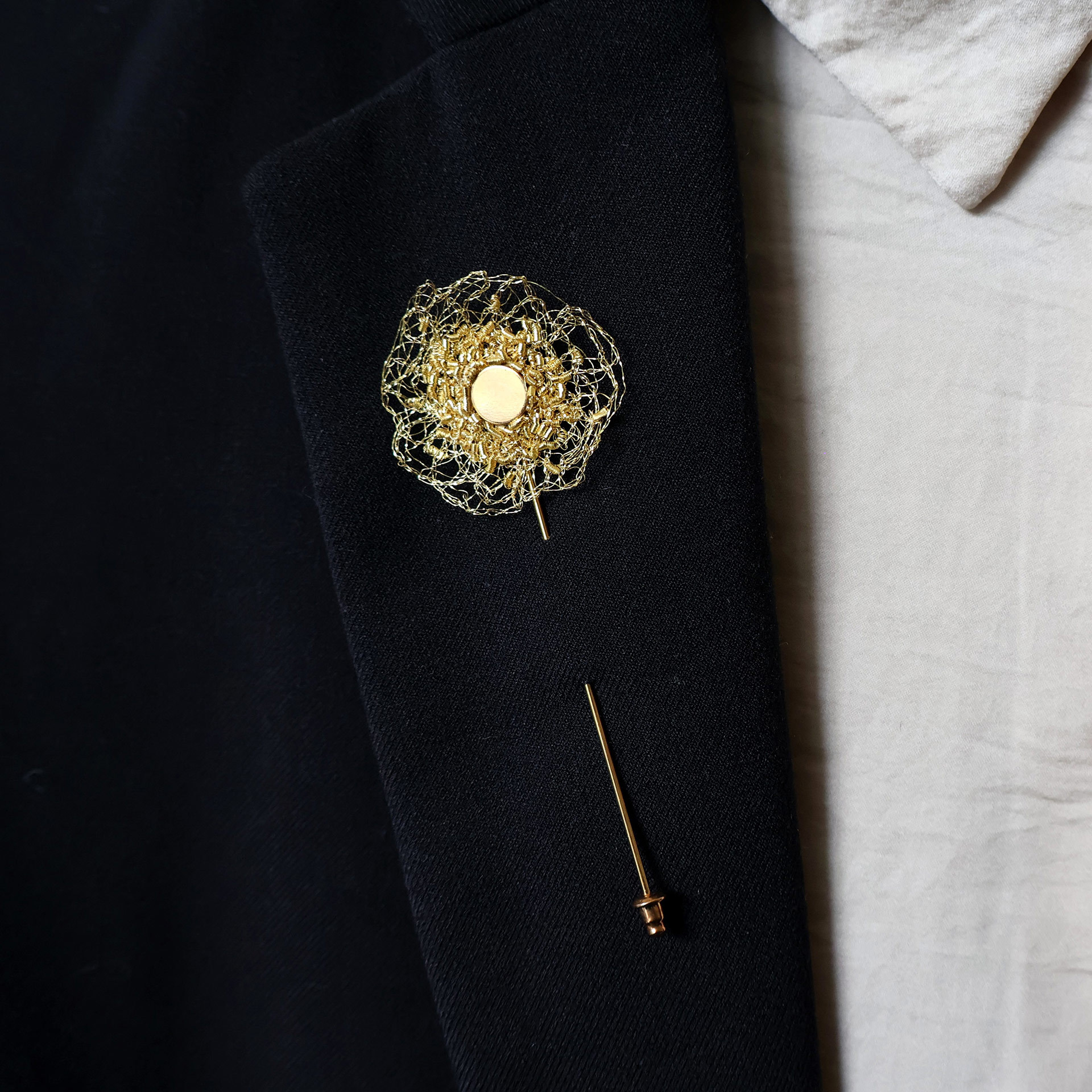 Adoptez la boutonnière Stella pour une note d’éclat doré qui sublimera votre tenue, que ce soit pour une journée spéciale ou pour votre quotidien.