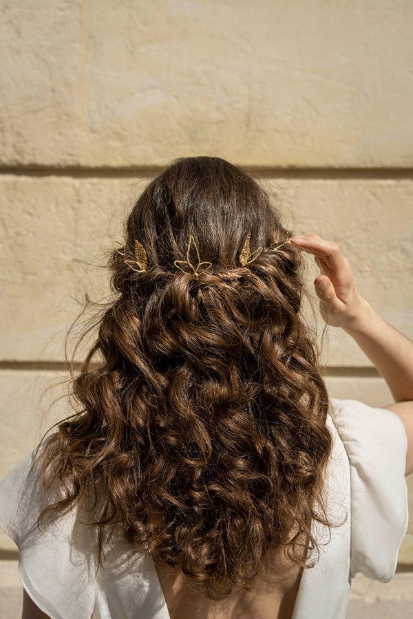 Le bijoux Folÿs se piquent facilement dans différentes coiffures, lâchées, relevées ou tressées. Ils se fixent solidement dans les cheveux et leur légèreté permet de les porter confortablement tout au long de la journée.