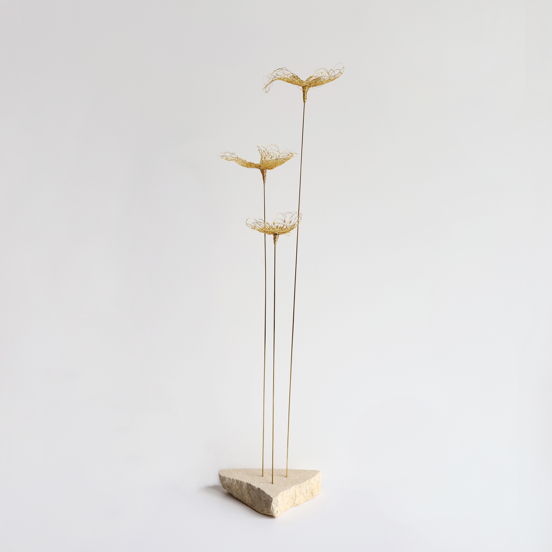 Brodée de fils dorés, Trifo est une sculpture unique inspirée des fleurs de trèfle.