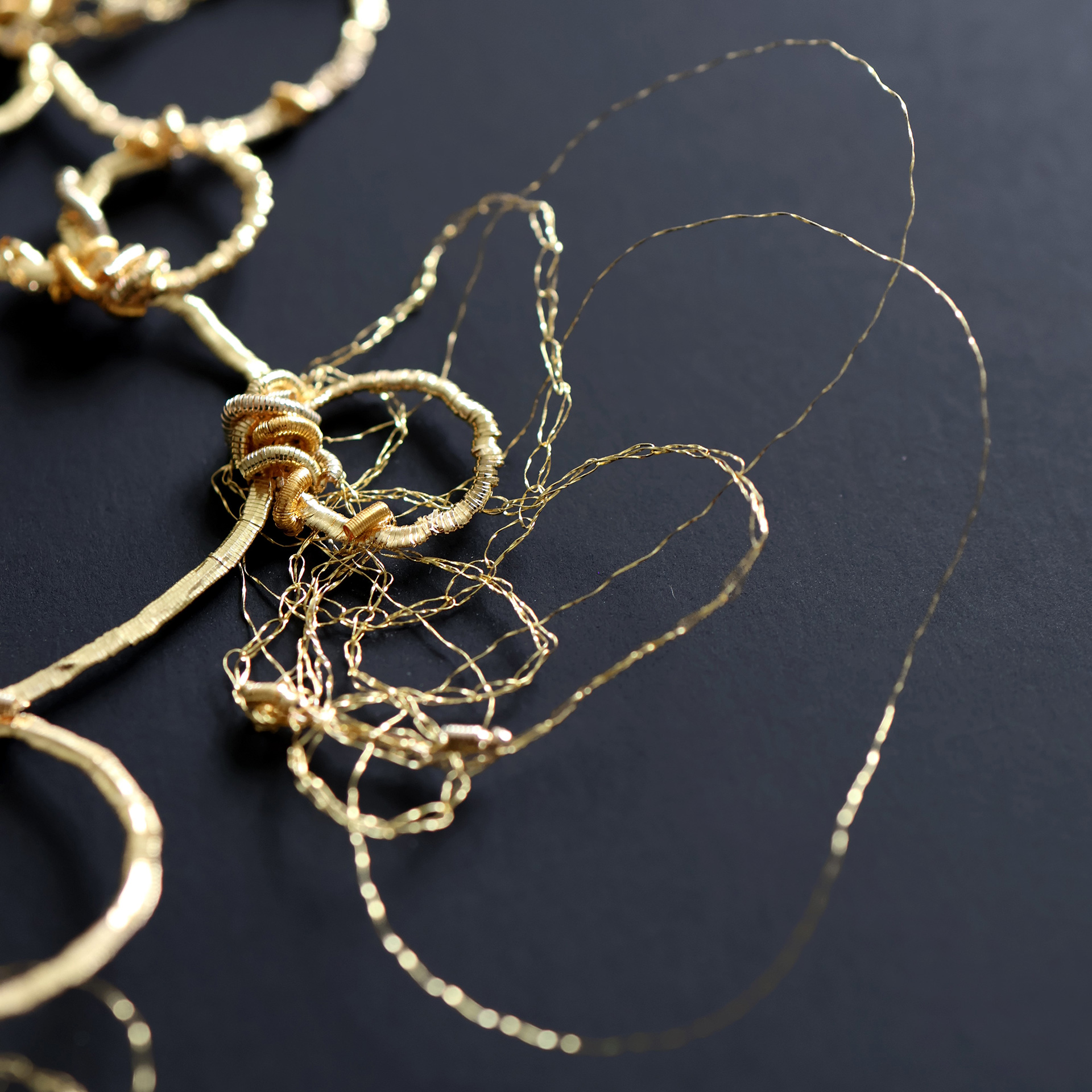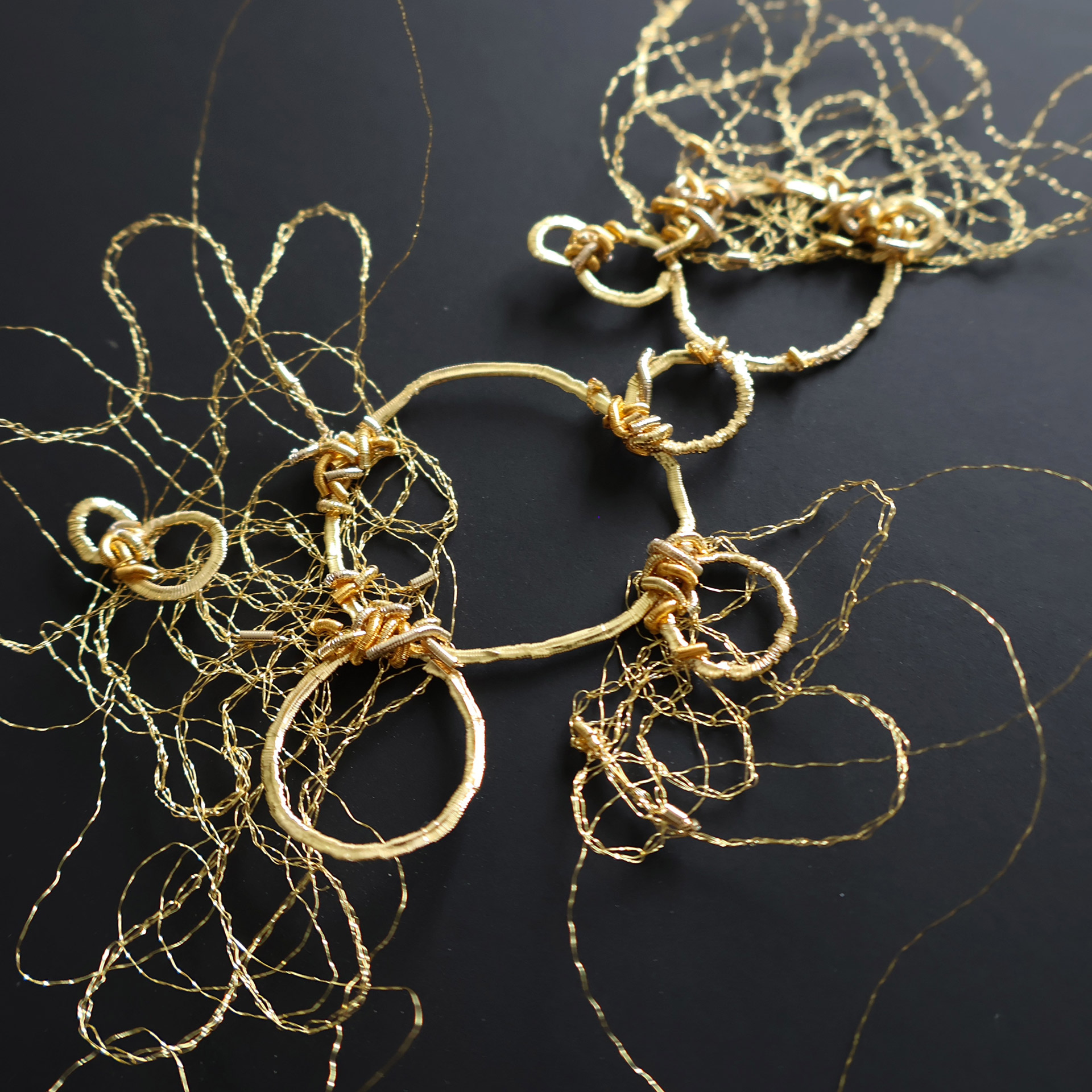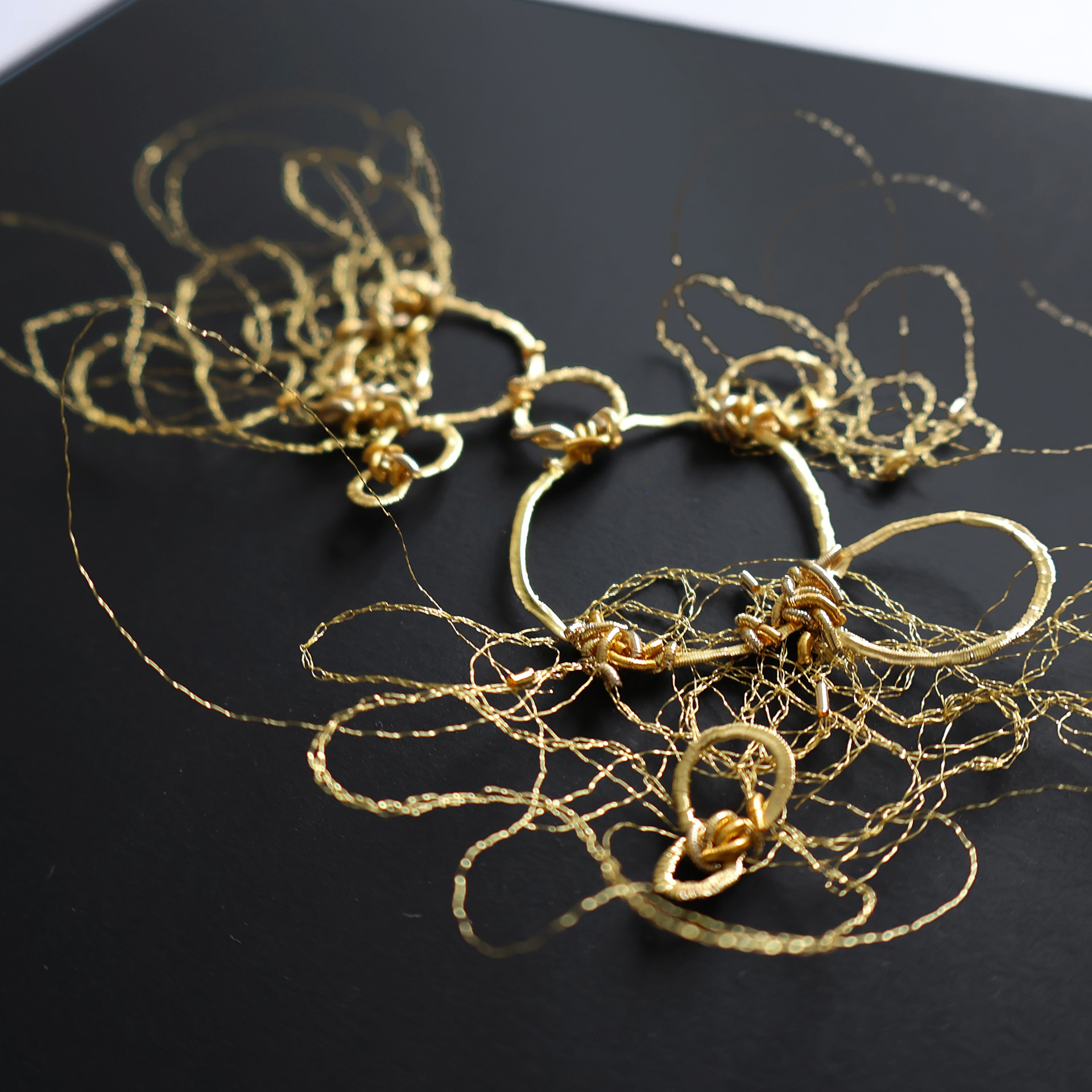 - Broderie de fil de cuivre vernis à l’or, laiton, cannetille.
