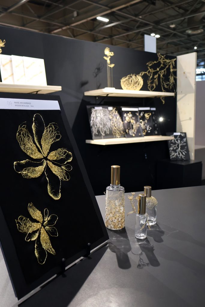 Situé dans une ancienne imprimerie du début du siècle dernier au cœur du Marais, le FAFCEA initie le salon Immersions pour présenter des savoir-faire d’artisans d’exception. Au rez-de-chaussée, l’atelier Marie Archambaud expose parures, bijoux et échantillons brodés.